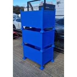 These stacking steel stillages have a capacity of 600kg and have sheet steel sides.
