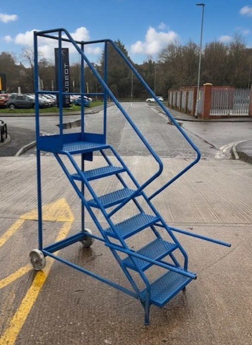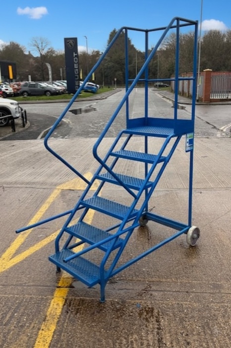 The mobile ladder is fitted with our industrial hi-grip step as standard, also a 100mm kick-plate and safety operating sticker.