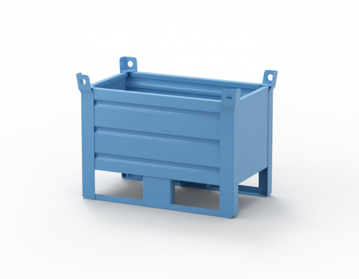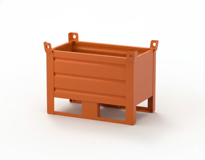 Our standard stacking steel stillages have a 700kg capacity and are solid sided and have forklift skids. The stillages come with forklift eyes on each corner.