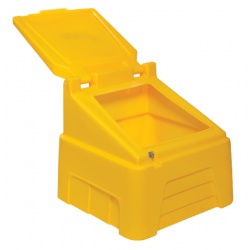 These bins will not discolour or deteriorate through long term exposure to the elements. The hinged lid protects the grit or salt within. The lid has a GRIT logo moulded into the top so it wont scratch off. The locks are electro plated hasp and staple type and will not rust.