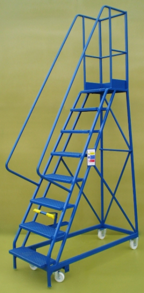 Our standard range sports 2 fixed castors at the rear end and 2 swivel castors at the front. These swivel castors can be raised so the steps frame bottoms out on the ground. The handle mechanism is mounted within the body of the mobile steps helping to keep the steps narrow.