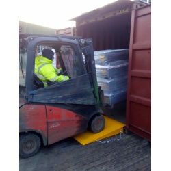 This ramp is for access into shipping containers for forklifts. The heavy duty construction offers an impressive load capacity of 5000kg. The container ramp surface is chequer plate offering a good level of grip for forklift tyres. The 2 cutouts at the front are for a forklift to pick the ramp up making it easy to move the ramp from container to container, or if the shipping container doors need to be closed.
