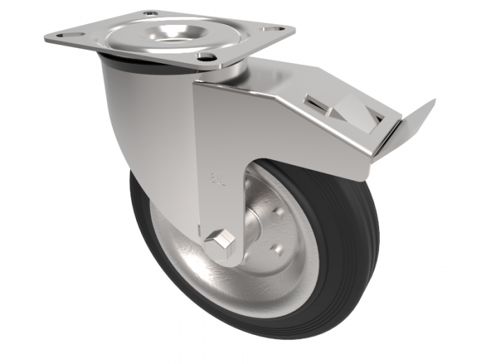 Black rubber swivel braked castor on steel centre