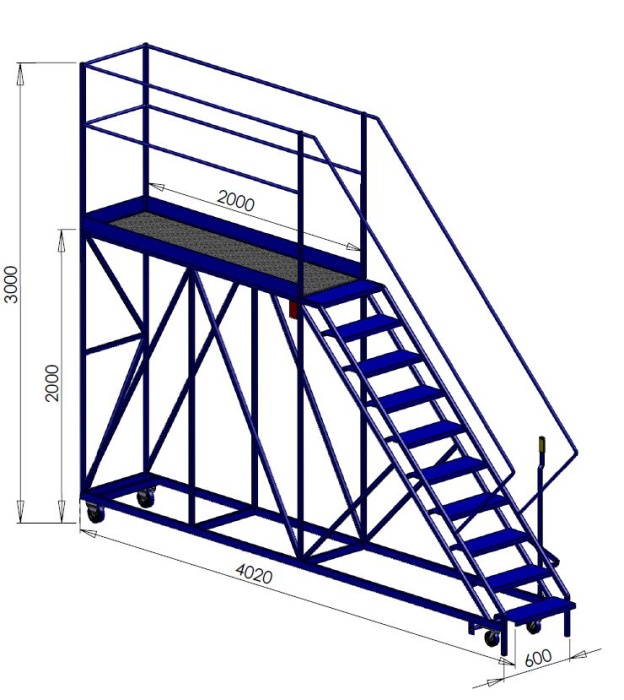 These gantry steps are made from either 3/4 inch or full inch box, this is a sturdy and rigid construction with good strength, these steps have 4 wheels, 2 fixed 2 swivel for easy manoeuvring. There is a handrail to 1 long side and 1 end with 1 side open.