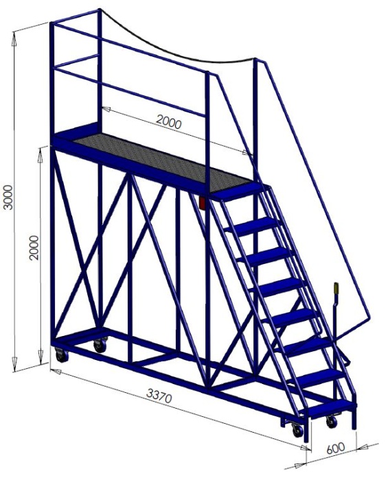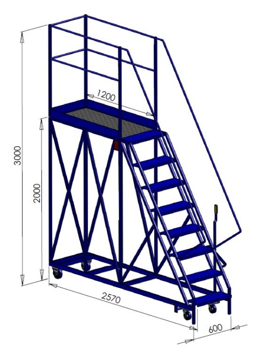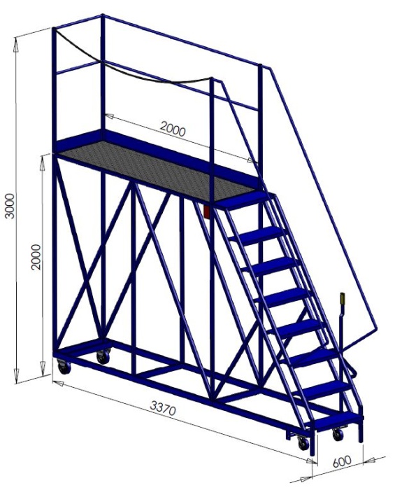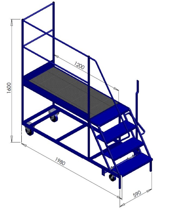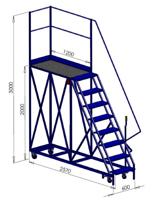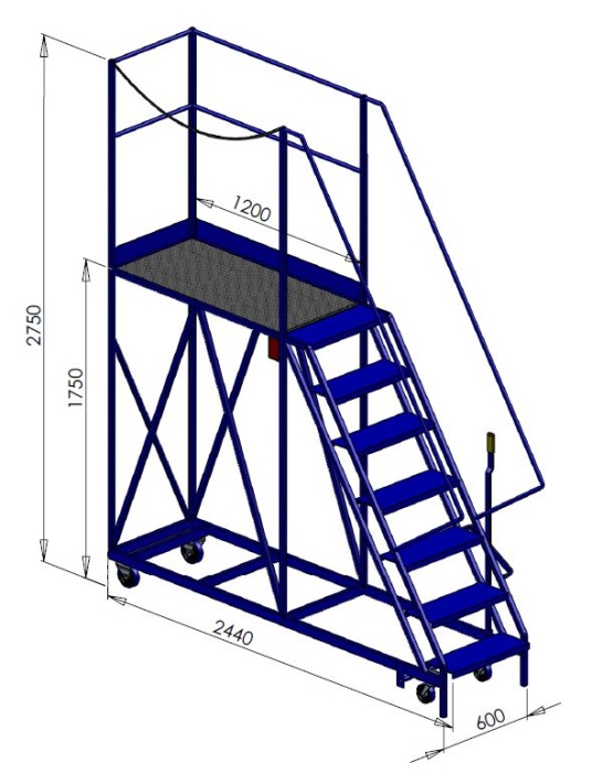 These gantry steps are made from either 3/4 inch or full inch box, this is a sturdy and rigid construction with good strength, these steps have 4 wheels, 2 fixed 2 swivel for easy manoeuvring. There is a handrail to 1 long side and 1 end with 1 side open.