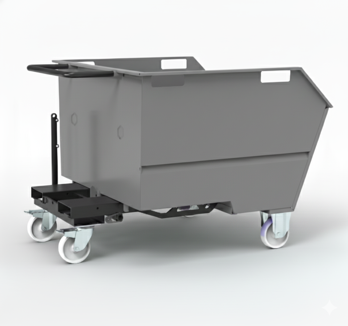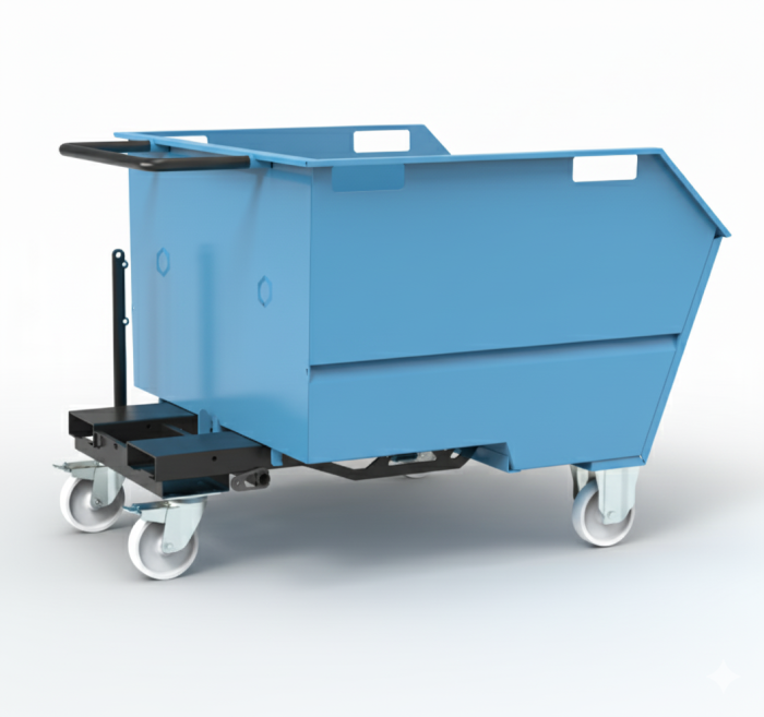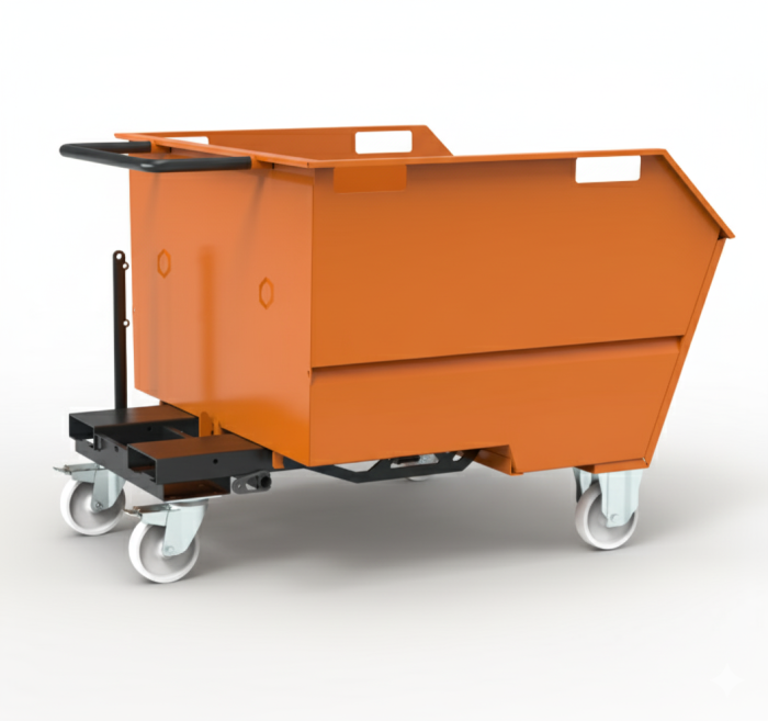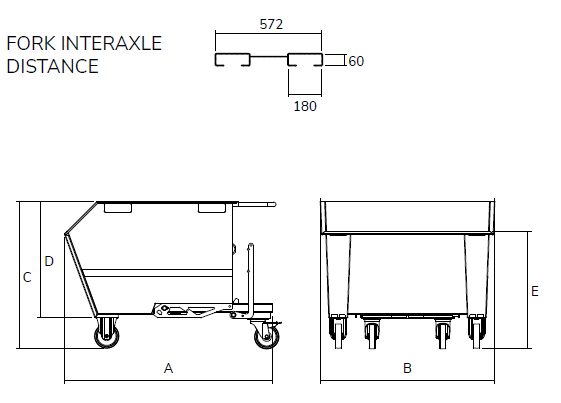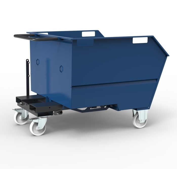 The tipping skip sits on 125mm dia nylon wheels housed in 2 fixed and 2 swivel castors allowing for easy movement via a sturdy push handle. For forklift use, there are channels incorporated in the skip subframe to securely locate the forks and prevent the tipping skip from sliding off the forks.