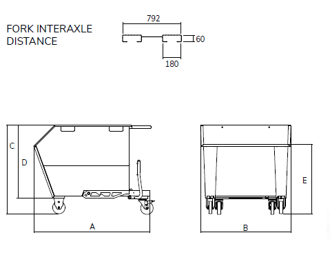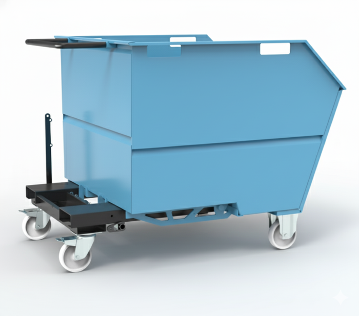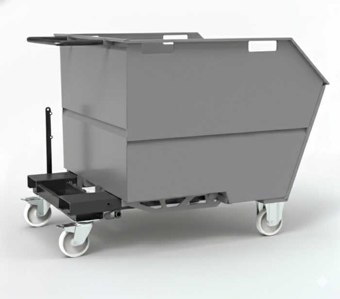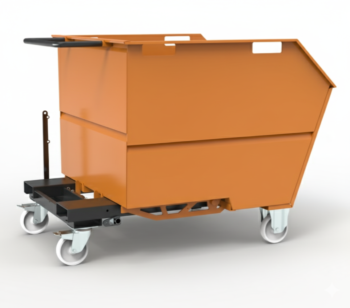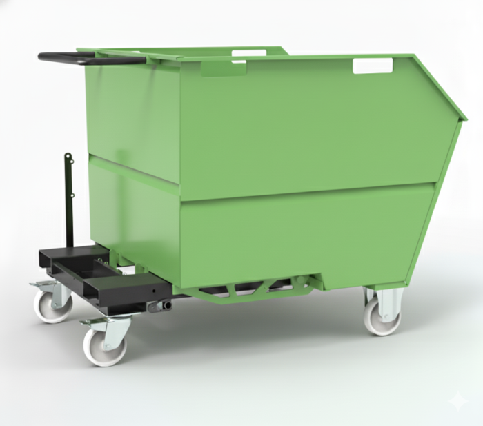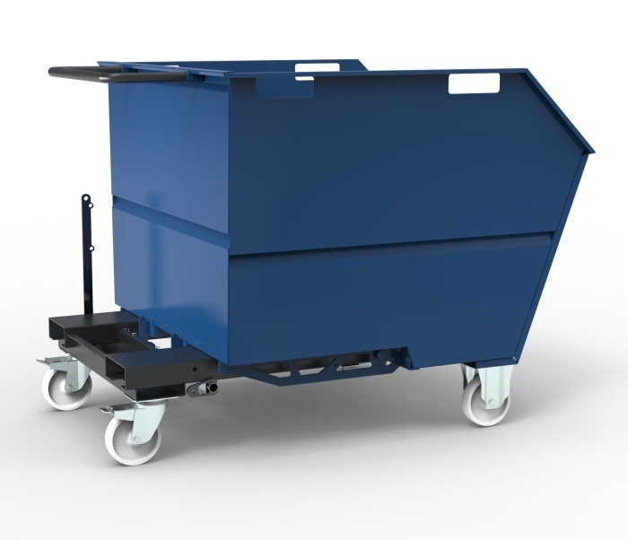 The tipping skip sits on 125mm dia nylon wheels housed in 2 fixed and 2 swivel castors allowing for easy movement via a sturdy push handle. For forklift use, there are channels incorporated in the skip subframe to securely locate the forks and prevent the tipping skip from sliding off the forks.