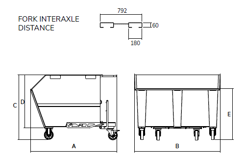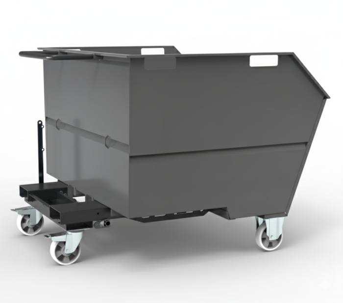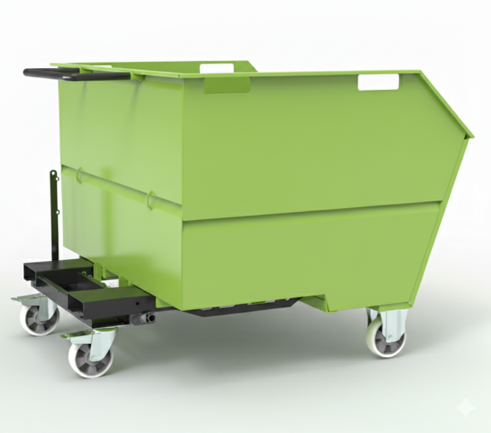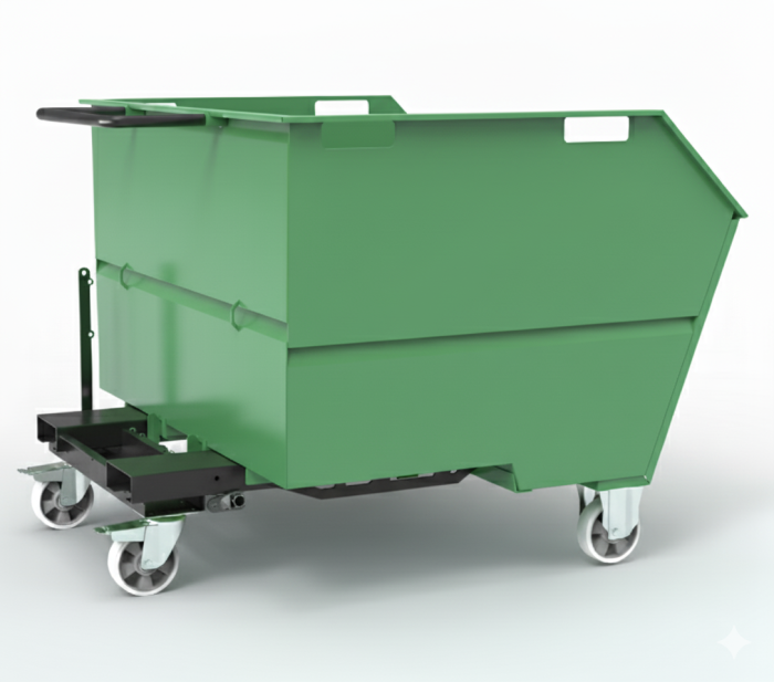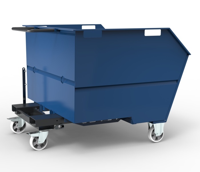 The tipping skip sits on 125mm dia nylon wheels housed in 2 fixed and 2 swivel castors allowing for easy movement via a sturdy push handle. For forklift use, there are channels incorporated in the skip subframe to securely locate the forks and prevent the tipping skip from sliding off the forks.