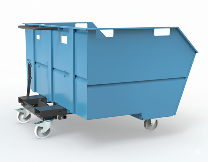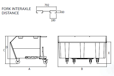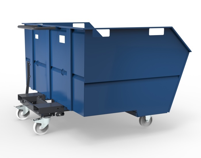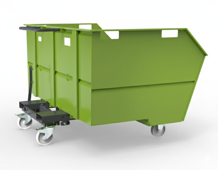 The tipping skip sits on 160mm dia nylon wheels housed in 2 fixed and 2 swivel castors allowing for easy movement via a sturdy push handle. For forklift use, there are channels incorporated in the skip subframe to securely locate the forks and prevent the tipping skip from sliding off the forks.