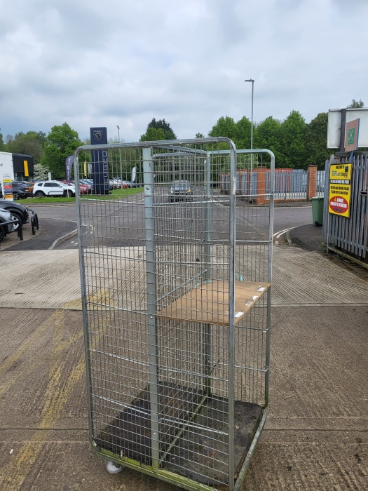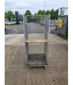 These 2 sided mesh trolleys are used but in good working order fully refurbished and re-sprayed if required as an option. These cages have 2 wooden removable shelves per each side of cage, with 5 choices of shelf heights.