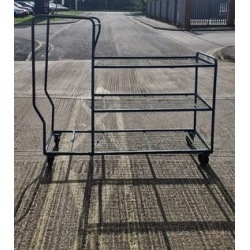 A robust second hand used picking trolley with a two shelves and a base that can be used as additional storage. At the rear are 2 push handles to ensure easy and efficient maneuvering on the stillage's 4 swivel castors.